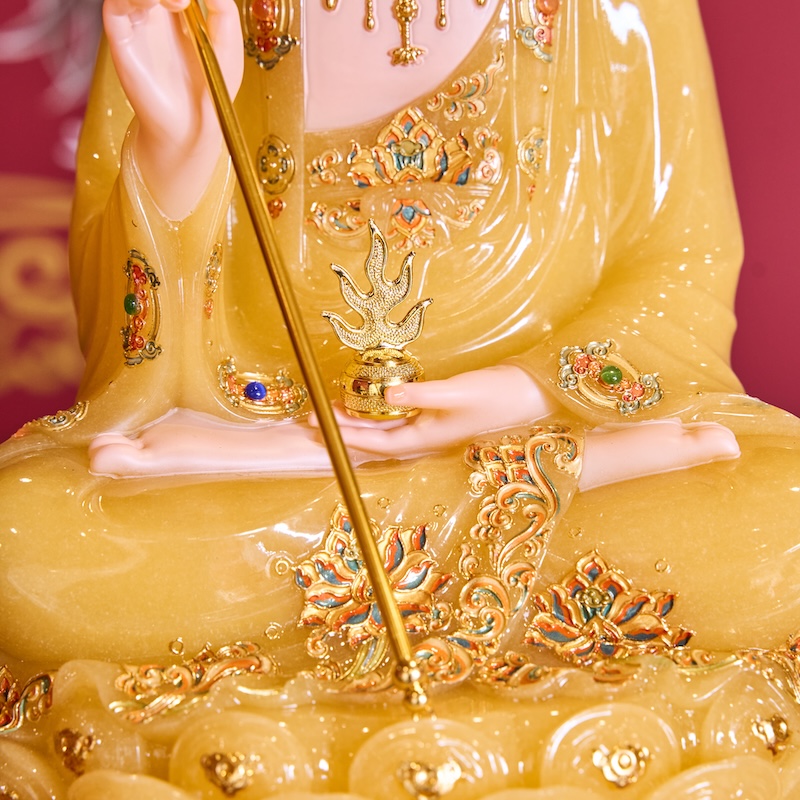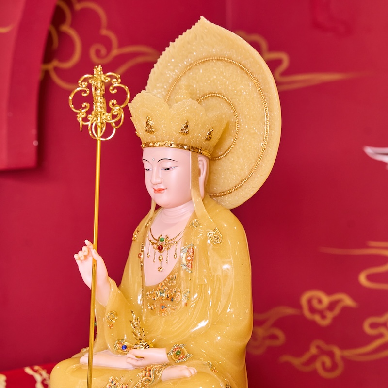 – Tên SP: Tôn Tượng Địa Tạng Vương Bồ Tát Tọa Đài Sen Vàng Thạch Anh Có Lá Đề