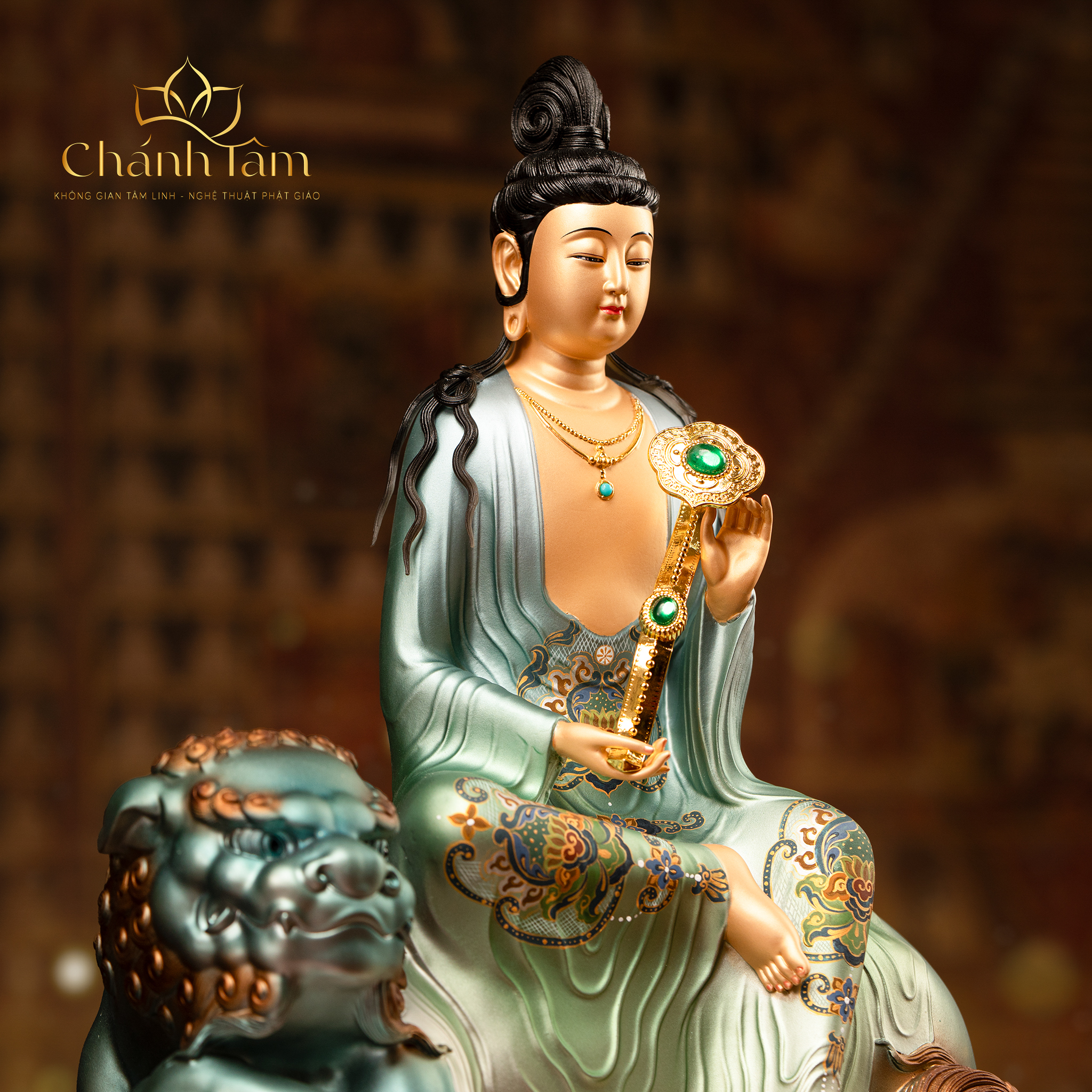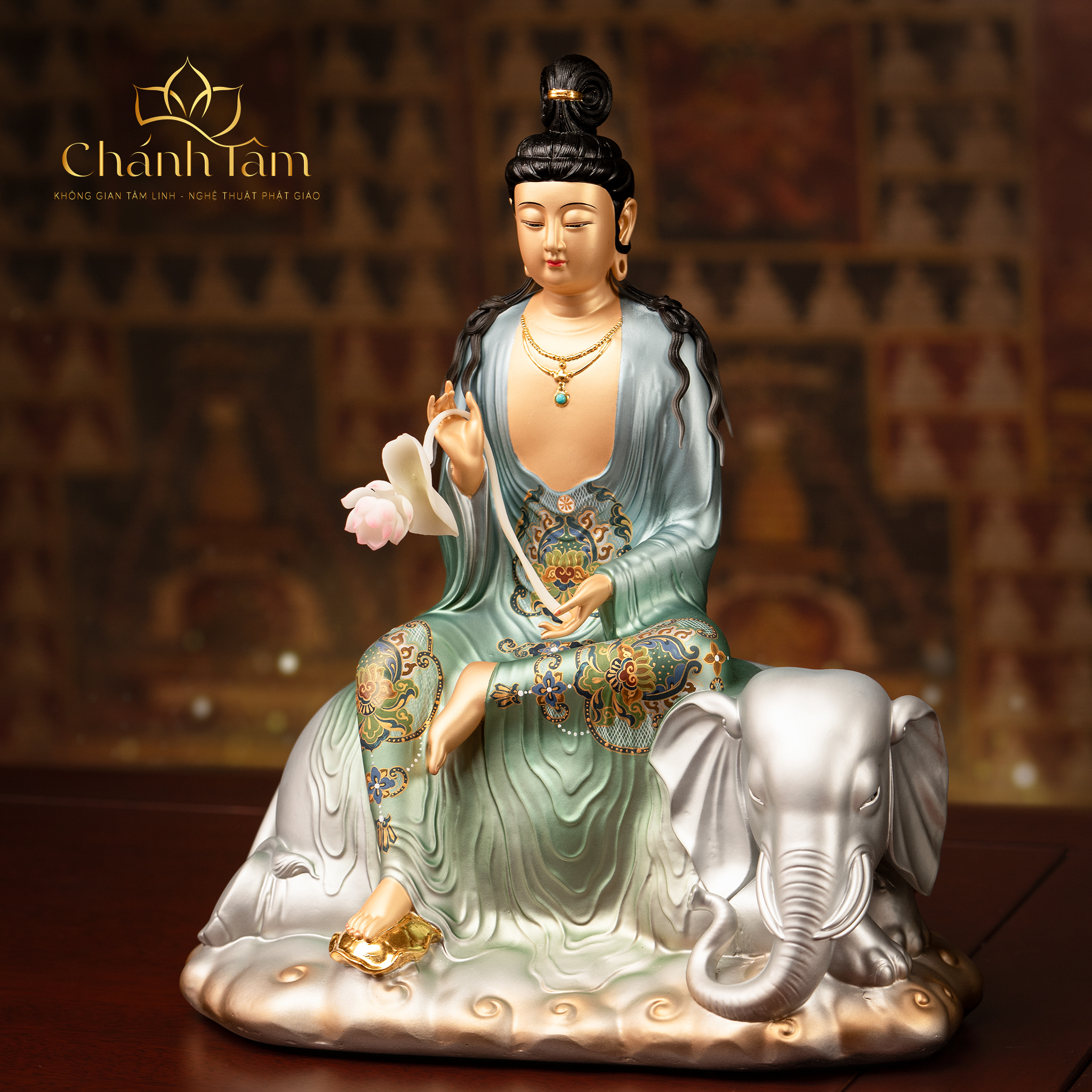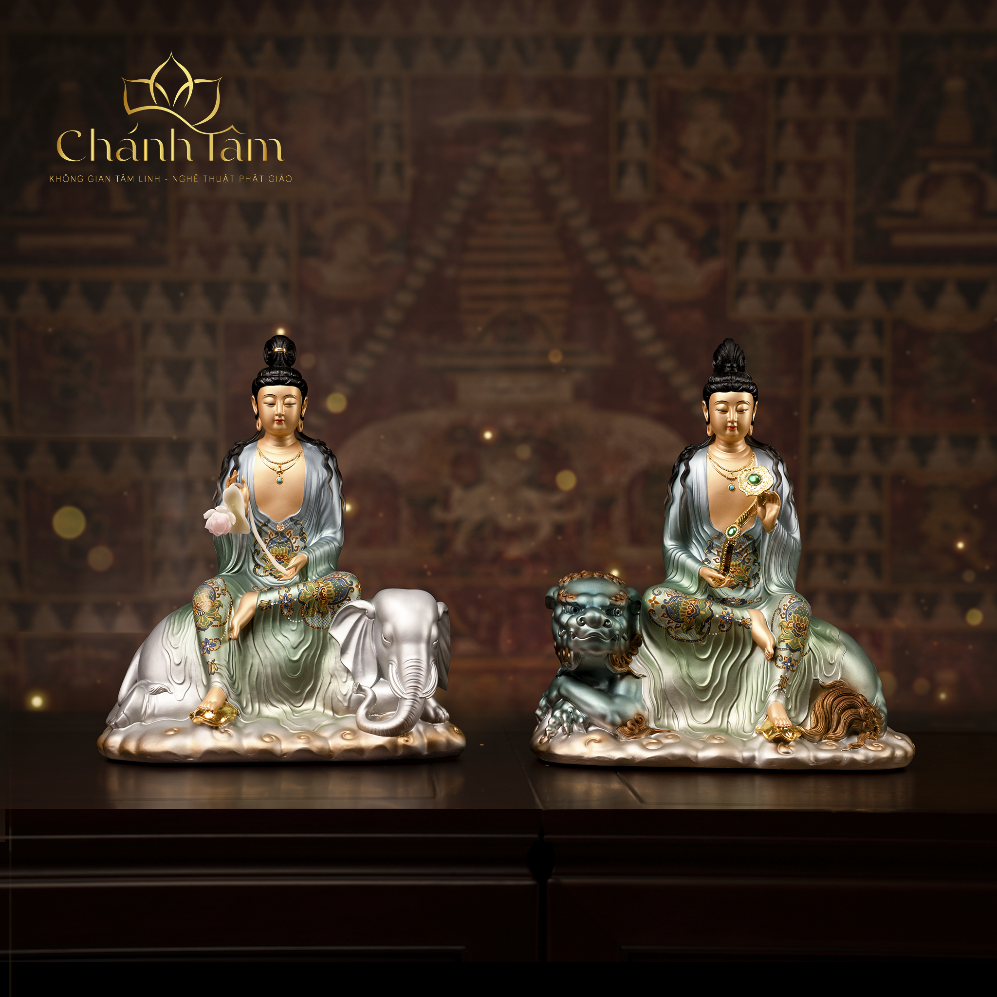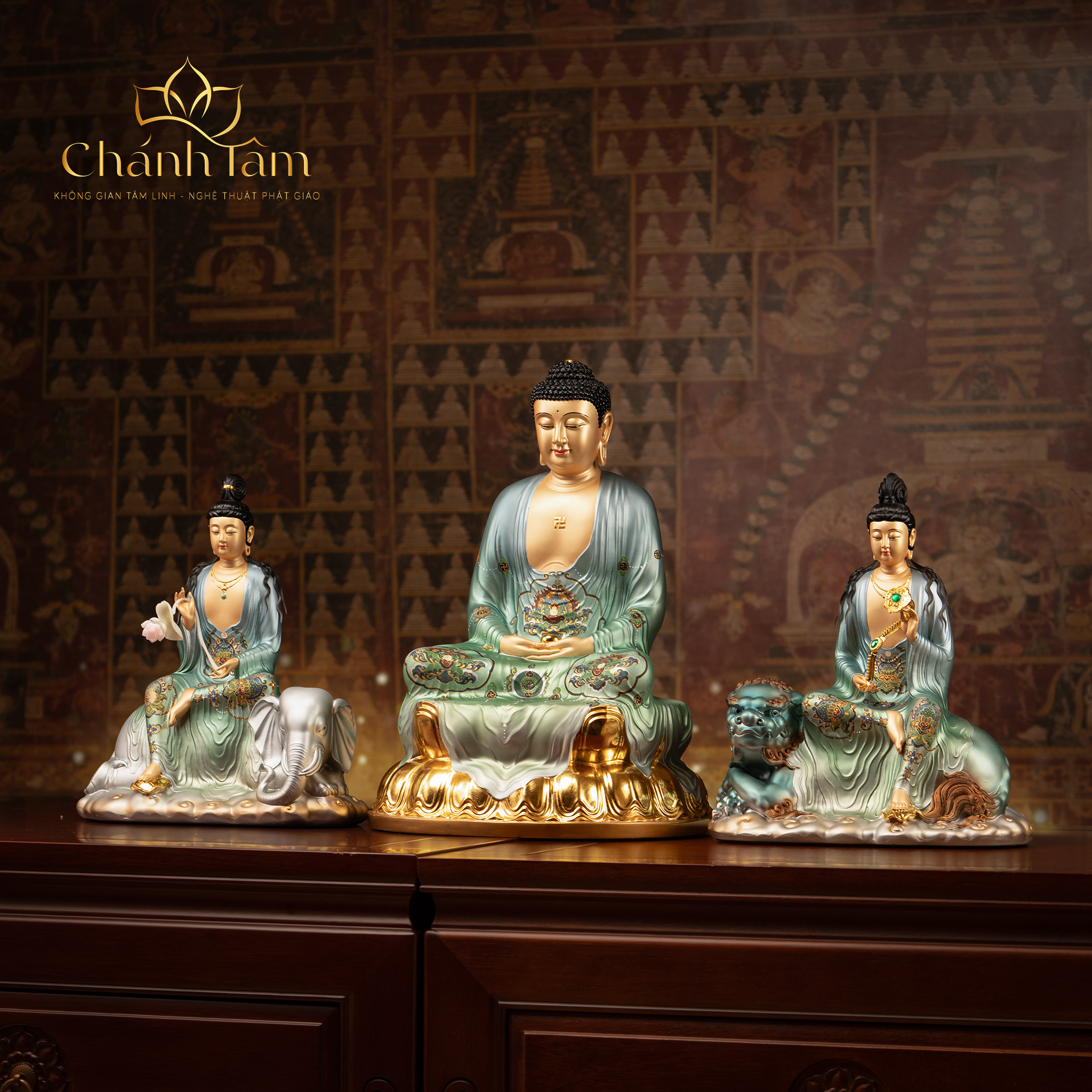 Tôn Tượng Hoa Nghiêm Tam Thánh, hay còn gọi Thích Ca Tam thánh vì ý nghĩa chủ yếu được nêu tỏ trong Kinh Hoa Nghiêm. Theo đó, Đức Phật Thích Ca ở giữa, Bồ tát Văn Thù cưỡi sư tử xanh hầu bên phải và Bồ tát Phổ Hiền cưỡi voi trắng sáu ngà hầu bên trái. Phổ Hiền Bồ Tát và Văn Thù Sư Lợi Bồ Tát là hai vị Đại Bồ tát thị giả đắc lực của Phật Thích Ca Mâu Ni trong việc hộ trì Phật pháp hoằng pháp độ sanh.