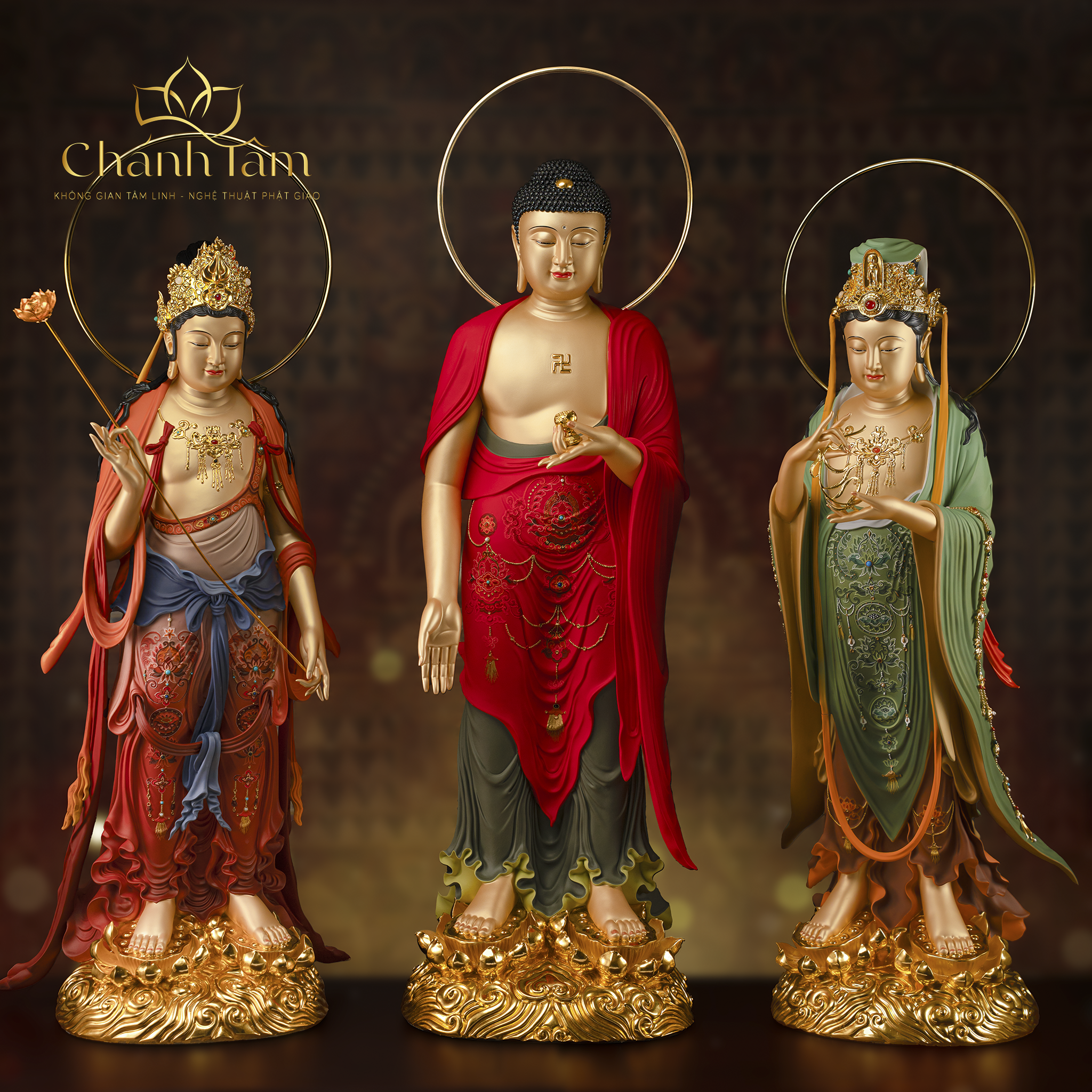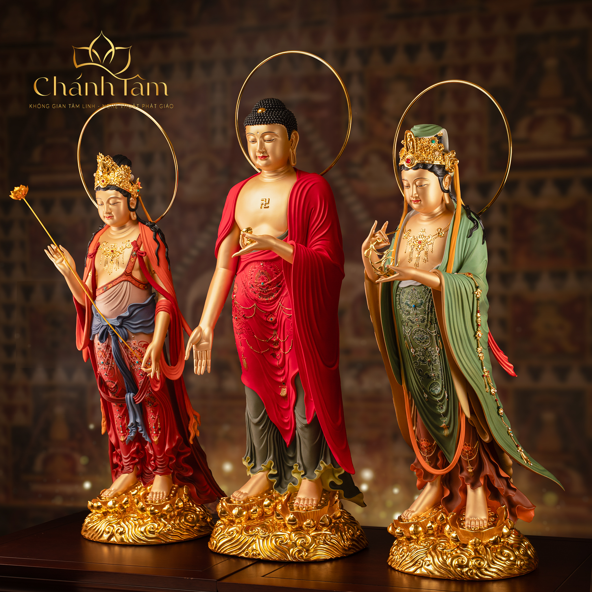 Tôn Tượng Tây Phương Tam Thánh là biểu tượng Phật Giáo quan trọng, nhất là với tín đồ Tịnh Độ Tông. Tây Phương Tam Thánh bao gồm Bồ Tát Quan Thế Âm, Bồ Tát Đại Thế và Đức Phật A Di Đà, là ba vị cai quản cõi Tây Phương Cực Lạc, nơi không có buồn đau, u sầu. Bộ tượng Tây Phương Tam Thánh được làm từ chất liệu cao cấp, mang vẻ ngoài bóng đẹp, có tính thẩm mỹ và độ bền cao.